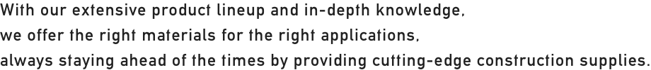 当社は創業以来培ってきた信頼と豊富な経験をもとに、街づくりに欠かすことのできない最先端の商品情報や最適な提案を通じ、さまざまな現場において、より良いサービスと高品質な資材をご提供します。