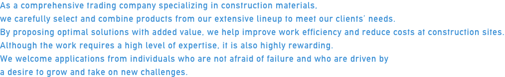 当社は、建設資材の総合商社としてニーズに合った商品を取扱い商品の中からセレクトして、組合せ、提案し、付加価値を付けてご提供することで、お客様の工事の効率アップやコスト削減をサポートします。